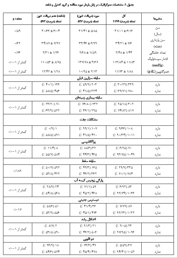 مشخصات دموگرافیک: سن، سن بارداری، تعداد بارداری، سابقه سقط، سابقه سزارین.