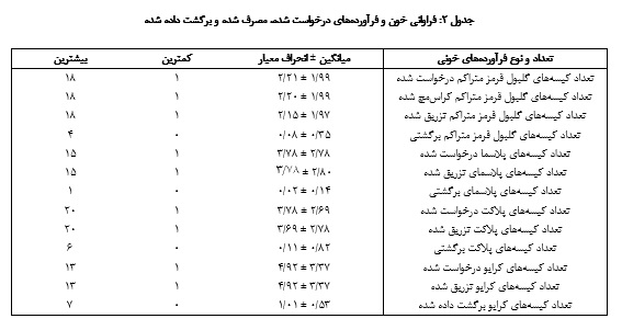 مشخصات مرتبط با تزریق خون: تعداد واحدهای تزریق ‌شده از گلبول قرمز متراکم، پلاکت و پلاسما.
