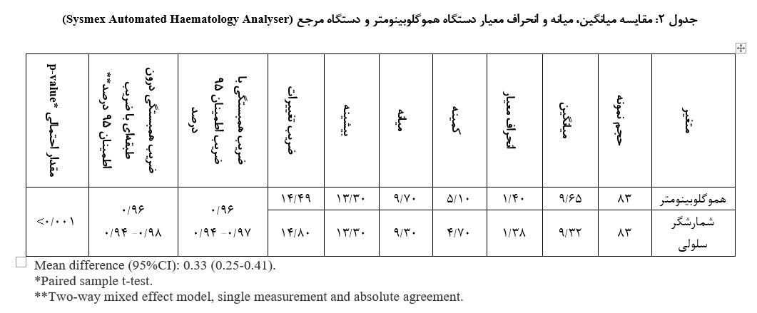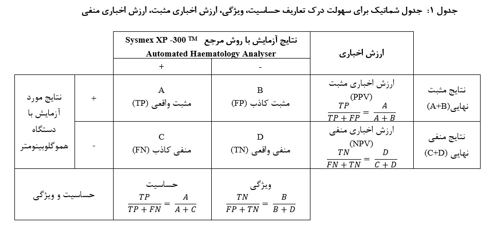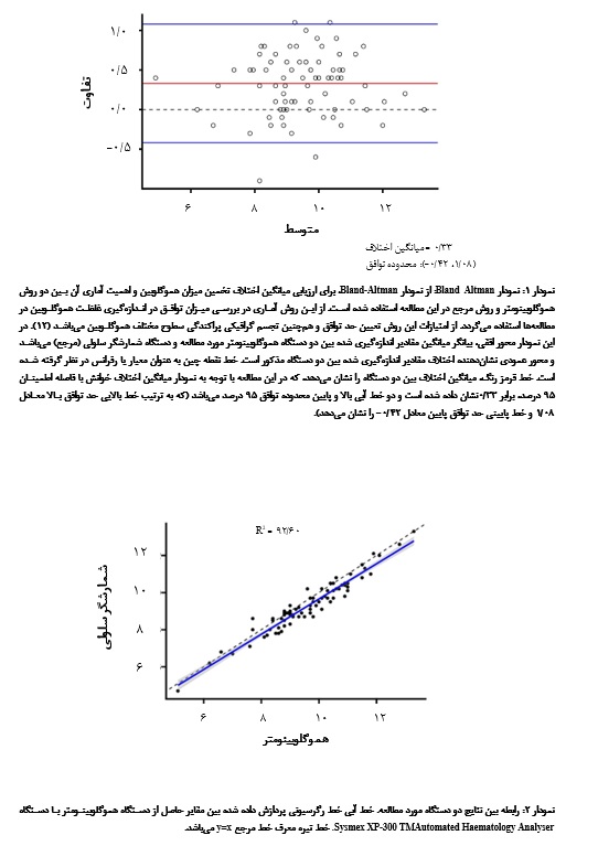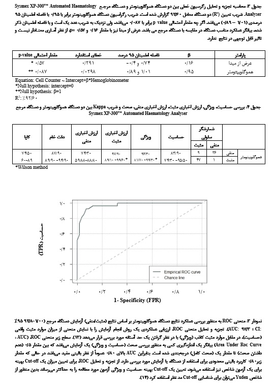 9. Asiyabi S, Amini-Kafiabad S, Gholizadeh HR, Salek Moghaddam E, Abbasian A, Rafiee MH. Evaluation and diagnostic value of the Knowledge enterprise hemoglobinometer compared to the Reference method (Sysmex XT 2000i Automated Haematology Analyser) and the ComPoLab TM hemoglobinometer. J Iran Blood Transfus 2024; 21(4): 281-94. [Article in Farsi] [