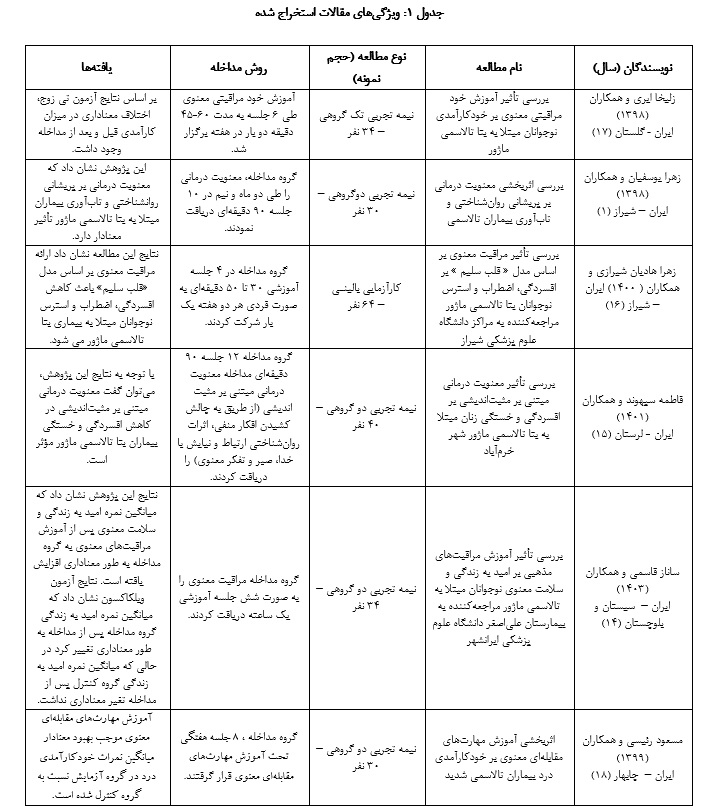 1. Yousefian Z, Ahadi H, Mojmanari AK. The effectiveness of spirituality therapy on psychological distress and resilience of thalassemia patients. J Psychol Sci 2020; 18(84): 23-35.