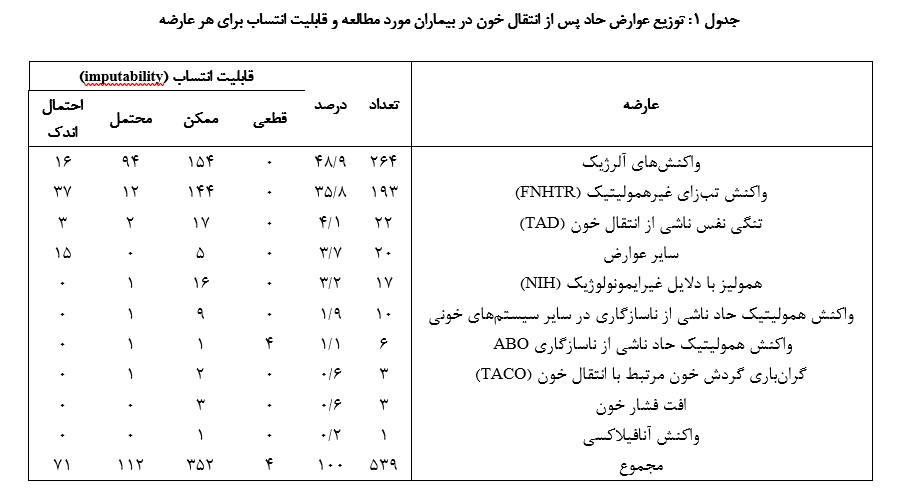 شایع‌ترین عوارض حاد پس از انتقال خون شامل واکنش‌های آلرژیک (۲۶۴ نفر؛ 9/48 درصد از عوارض حاد گزارش شده) و FNHTR (۱۹۳نفر؛ ۸/۳۵ درصد از عوارض حاد گزارش شده) بودند که به ترتیب معادل 11/0 درصد و 08/0 درصد از کل فرآورده‌های خونی تزریق شده می‌باشند. سایر عوارض، شامل تنگی نفس نـاشی از انتقال خون (Transfusion-Associated Dyspnea; TAD)، همولیز با علل غیرایمونولوژیک (Non-Immune Hemolysis; NIH) ، واکنش همولیتیک حـاد ناشی از ناسازگاری در سایر سیستم‌های خونی، واکنش همولیتیک حـاد ناشی از نـاسازگاری  ABO، TACO، افت فشار خون و واکنش آنافیلاکسی بودند که همگی با شیوع کمتر از ۵ درصد مشاهده شدند. از مجموع ۵۳۹ بیماری که دچار عوارض انتقال خون شدند، ۴۰ بیمار مبتلا بـه تالاسمی بودند که با توجه به اهمیت، در گروه مجزای بیماران تالاسمی مورد بررسی قرار گرفتند. در میان این بیماران ۲۵ مورد (64/۴ درصد) واکنش آلرژیک، ۱۴ مورد (60/2 درصد) FNHTR و ۱ مورد (19/0 درصد) واکنش همولیتیک حاد ناشی از ناسازگاری در سایر سیستم‌های خونی مشاهده شد. در جدول، تعداد و درصد هر عارضه به همراه میزان قابلیت انتساب (Imputability) گزارش شده است (جدول 1). منظور از قابلیت انتساب، درجـه اطمینان از ارتباط میان عارضه مشاهده‌شده و فرآیند انتقال خون یا فرآورده‌ خونی می‌باشد.