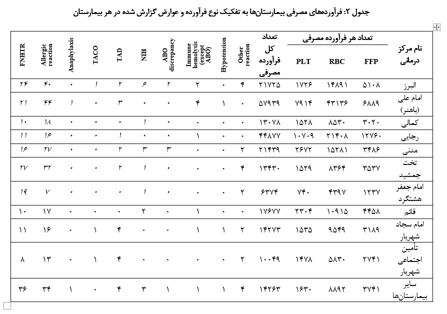 در ادامه، تعداد فرآورده‌های مصرفی به تفکیک نوع فرآورده و هم‌چنین عوارض ایجاد شده طی چهار سال در بیمارستان‌های استان البرز ارائه شده است (جدول ۲). طبق اطلاعات موجود، بیشترین فرآورده مصرفی به ترتیب مربوط بـه گلبول‌های قرمز (Red Blood Cells; RBC)، پلاسمای تازه منجمد شده (Fresh Frozen Plasma; FFP) و پلاکـت‌ها (Platelets; PLT) است. افزون بر این، میزان عوارض حـاد انتقال خون در هر بیمارستان به تفکیک آورده شده اســـت که نشان می‌دهد در همه بیمارستان‌ها بــه جـز بیمارستـان