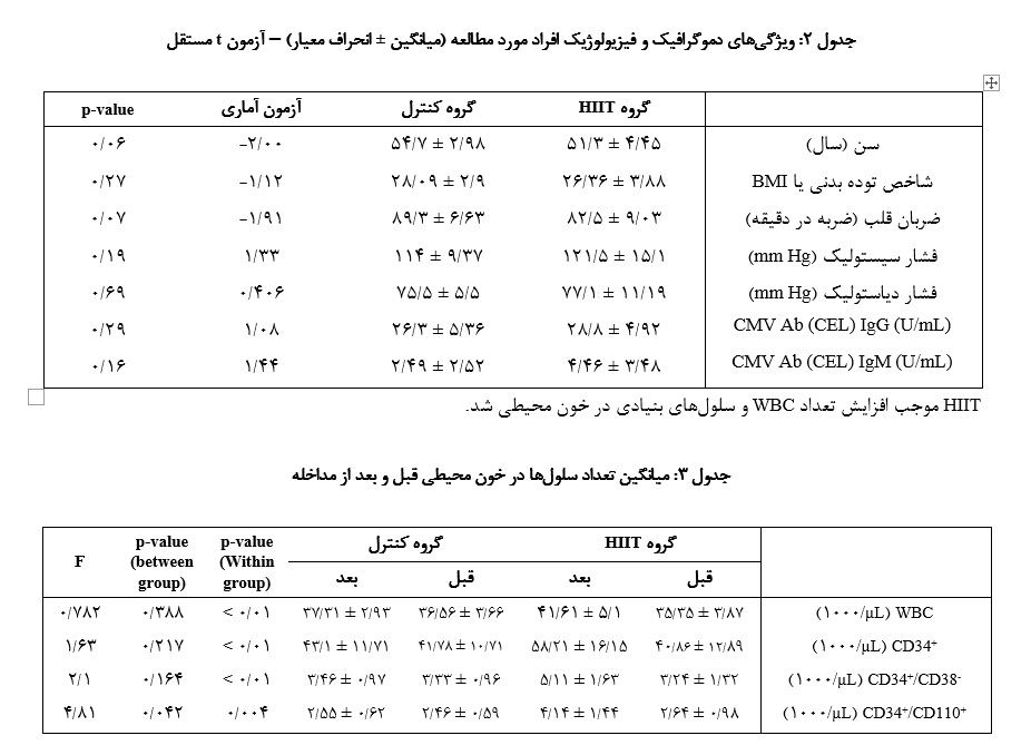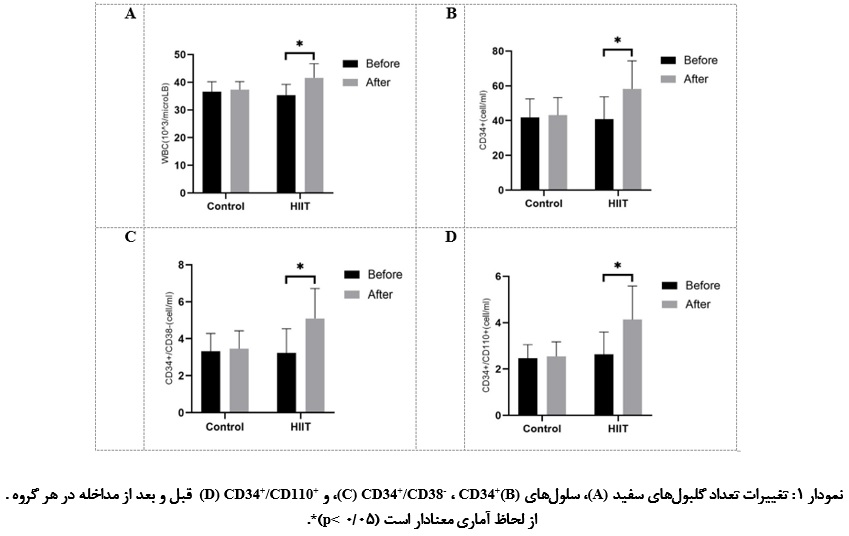 آزمون ANOVA بـا اندازه‌گیری‌های مکرر نشان داد که اگر چه تفاوت معناداری بین گروه‌ها در تعداد  WBC، CD34+ و CD34+/CD38- وجود نداشت، اما تعداد سلول‌هایCD34+/CD110+  در گروه HIIT به‌ طور معناداری بیشتر از گروه کنترل بود (05/0 p<)(d~1-1.4). هم‌چنین در گروه HIIT ، تفاوت معناداری در تمام شاخص‌هـا قبل و بعد از تمرین مشاهده شد (05/0 p<).