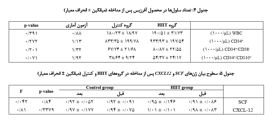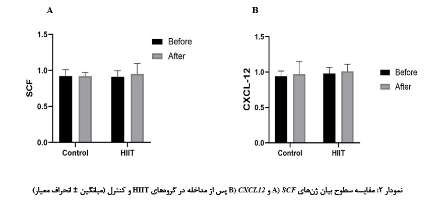همان‌طـور کـه در جدول ۵ و شکـل ۲ نشـان داده شده است، نتایج آزمون تجزیـه و تحلیل واریانس(ANOVA) اختلاف معناداری در سطح بیان ژن‌های SCF و  CXCL-12 بین گروه‌های HIIT و کنترل نشان نداد.