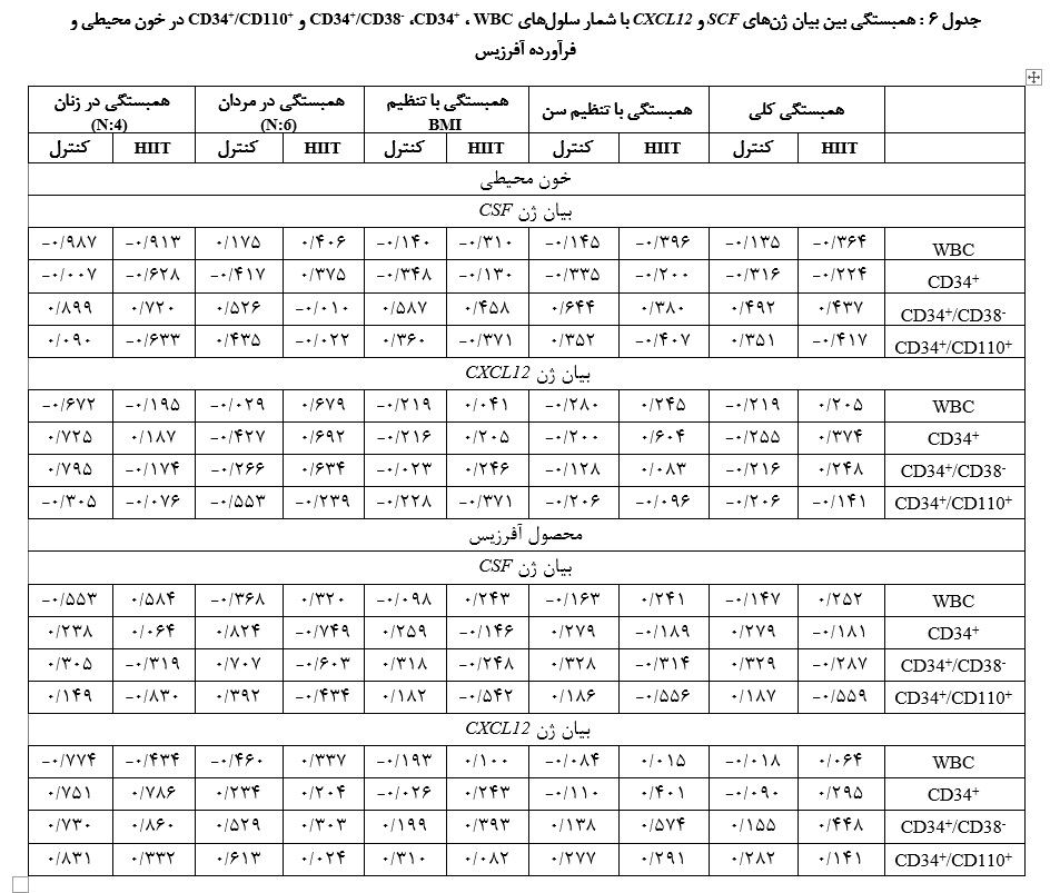 پس از HIIT، میانگین تعداد سلول‌های CD34+ از 89/12 ± 86/40 به 15/16 ± 21/58 و گلبول‌های سفید از 87/3 ± 35/35 به 1/5 ± 61/41 افزایش یافت، در حالی که تغییرات گروه کنترل اندک بود. تمرین HIIT باعث افزایش معنا‌دار تعداد WBC، سلول‌های +CD34 و زیر گروه CD34+/CD110+ در خون محیطی با اندازه اثر قابل توجه شد (05/0 p<)(d~1-1.4). اما این افزایش در محصول(Yield)  آفرزیس مشاهده نگردید. هم‌چنین، هیچ تغییر معناداری در بیان ژن‌های SCF و CXCL-12 پس از تمرین دیده نشد و همبستگی قابل توجهی بین بیان این ژن‌ها و شمارش سلول‌های بنیادی مشاهده نشد.