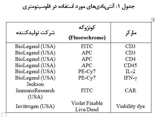 محیط‌های کشت سلولی: محیط‌های کشت RPMI1640 (Glu+) و DMEM از شرکت جیبکو، ImmunoCult™-XF T Cell Expansion Medium از شرکت StemCell Technologies تهیه گردیدند.
