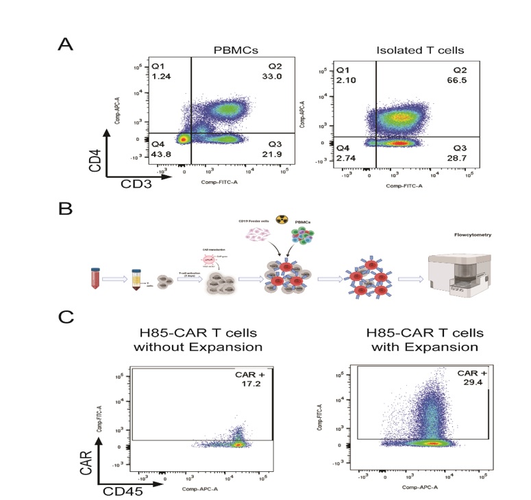 هر دو سازه طراحی ‌شده شامل ناحیه شناسایی‌کننده آنتی‌ژن (نـانوبادی)، ناحیه لولا (hinge)، نـاحیه ترانس ‌ممبران (CD3، 4-1BB و یا هر دو) و نـاحیه سیگنال‌دهنده داخل سلولیCD3  بودند که به ‌صورت توالی ژنی در پلاسمیدهای لنتی‌ویروسی کلون شدند. بررسی کیفیت سلول‌های T توسط فلوسیتومتری و مقایسه آن با سلول‌های PBMCs جدا شده از خون نشان می‌دهد که پس از جداسازی حدود 95% سلول‌ها حاوی CD3+ می‌باشند که در مقایسه با سلول‌های PBMCs (%45) میزان خلوص 2 برابر افزایش یافته ‌است (شکل A-1). بـا توجه به پایین بودن سطح بیان گیرنده کایمریک (CAR)  در سلول‌های T پس از ترانسداکشن اولیه با وکتور ویروسی، از یـک دستورالعمل بهینه‌سازی ‌شده برای تکثیر و گسترش سلول‌های ترانسداکت شده بهره گرفته شد. در این دستورالعمل، به‌ منظور بهبود زنده‌مانی، رشد، و القای بیان پایدار سازه در سلول‌های T، از سلول‌های مغذی استفاده گردید. بدین ترتیب، سلول‌های T ترانسداکت ‌شده در مجاورت سلول‌های مغذی که پیش‌تر با اشعه گاما غیرتکثیرپذیر شده بودند، در محیط کشت حاوی ترکیب سیتوکاین‌های IL-21، IL-15  وIL-7  بـه‌ مدت ۱۲ روز انکوبه شدند (شکل B-1).