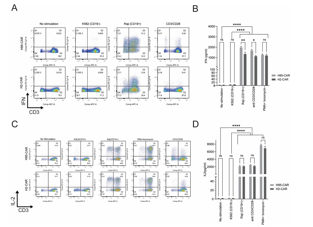 شکل 2: تحلیل عملکرد سلول‌های CAR-T در شرایط کشت متفاوت. A) تجزیه و تحلیل فلوسیتومتری داخل‌سلولی برای بررسی تولید اینترفرون-گاما (IFN-γ)  در سلول‌های CAR-T حاوی نانوبادی‌های H2 و H85 پس از کشت در شرایط مختلف. B) سنجش غلظت اینترفرون-گاما (IFN-γ) در مایع رویی سلول‌های CAR-T حاوی نانوبادی‌های H2 و H85 با استفاده از آزمون ELISA. C) بررسی تولید داخل‌سلولی اینترلوکین-2 با فلوسیتومتری پس از تحریک سلول‌های CAR-T حاوی نانوبادی‌های H2 و H85.D) سنجش غلظت اینترلوکین-2 در مایع رویی کشت با استفاده از آزمون  ELISA.  نمودارها بر اساس داده‌های حاصل از سه دهنده‌ی مستقل تهیه شده‌اند که هر آزمایش برای هر دهنده در شش تکرار انجام شده است. داده‌ها به‌ صورت میانگین ±  SEMنمایش داده شده‌اند. تجزیه و تحلیل آماری با استفاده از آزمون دو طرفه ANOVA (2-way ANOVA) انجام شد. ns: غیرمعنا‌دار (9999/0 p>)؛ * 05/0 p< ؛ ** 005/0 p< ؛ *** 0001/0 p= ؛ **** 0001/0 p< . بدون تحریک (کنترل منفی)، تحریک با آنتی‌بادی CD3/CD28 (کنترل مثبت)، کشت با سلول‌های Raji، کشت با سلول‌های K562 و تحریک با PMA/ionomycin (کنترل مثبت) بوده است.