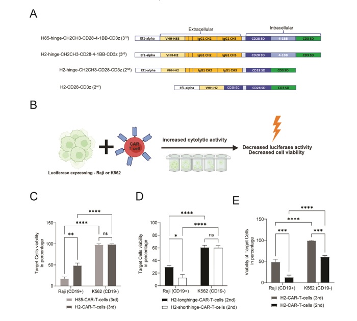 در ادامه، دو سازه از نسل دوم و سوم CAR، هر دو حاوی نانوبادی  H2، با یکدیگر مقایسه شدند (شکل E-3). نتایج نشان داد که هر دو سازه توانایی کشندگی معناداری علیه سلول‌های هدف CD19+ دارند، اما فعالیت سازه نسل دوم به ‌طور نسبی بالاتر از نسل سوم بوده و تفاوت معناداری بین این دو در پاسخ به سلول‌های هدف مشاهده شد. علاوه بر این، هر دو سازه به ‌طور معناداری بین سلول‌های Raji و K562 تمایز عملکردی از نظر کشندگی نشان دادند.