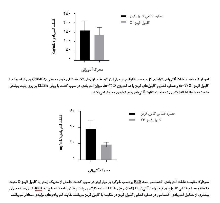 چکیده سابقه و هدف سیستم گروه خونی Rh یکی از مهمترین و پیچیدهترین سیستمهای آنتیژنی پس از ABO است. تولید آنتیبادیهای اختصاصی ضد RhD برای کاربردهای تشخیصی و درمانی اهمیت بالایی دارد. هدف از این مطالعه، ارزیابی پاسخ ایمنی ایجاد شده در سلولهای تک هستهای خون محیطی به وسیله گلبولهای قرمز واجد آنتیژن RhD و عصاره غشایی آنها در محیط کشت سلولی بود. مواد و روشها در این مطالعه تجربی، سلولهای تک هستهای خون محیطی (PBMCs) از 2 کیسه خون کامل با گروه خونی O منفی به روش گرادیان چگالی و با استفاده از معرف فایکول جداسازی شدند. سپس به منظورحذف سلولهای مهارکننده ایمنی، سوسپانسیون سلولی حاصله به مدت 40 دقیقه با لوسین متیل استر (5/2 میلیمولار) مواجه شده و پس از شستشو، در معرض گلبولهای قرمز واجد آنتیژن RhD و عصاره غشایی آنها در محیط کشت قرار گرفته و توانایی آنها در القای تولید آنتیبادی توتال و اختصاصی با استفاده از آزمون ELISA ارزیابی شد. با توجه به محدود بودن تعداد تکرارهای آزمایش، از روش ویلکاکسون به عنوان روش آماری غیر پارامتریک استفاده شد. یافتهها پس از ایمنسازی سلولهای PBMCs با گلبول قرمز O+ و عصاره غشایی آنها، میزان تولید آنتیبادی با روش کمـی ELISA تعیین شد. میانگیـن غلظـت تـوتال آنتیبـادی در مواجهـه بـا عصـاره غشایـی 19/51 ± 3/159 نانوگرم در میلیلیتر (4n=) و در مواجهه با گلبول قرمز کامل 9/38 ± 5/136 نانوگرم در میلیلیتر (2n=) ارزیابی شد. همچنین، غلظت آنتیبادی اختصاصی علیه RhD در حضور عصاره غشایی 58/10 ± 17/38 و در حضور گلبول قرمز کامل 95/2 ± 75/18 نانوگرم در میلیلیتر اندازهگیری شد. بر اساس دادهها، هر دو فرم آنتیژن قادر به القای پاسخ ایمنی هستند. آزمون ویلکاکسون نشان داد که تفاوت بین دو گروه از آنتیژنها در هر دو نوع ارزیابی آنتیبادی کل و آنتیبادیهای اختصاصی RhD معنادار نمیباشد. نتیجه گیری بر اساس یافتههای مطالعه، به نظر میرسد که آنتیژن غشایی گلبول قرمز نسبت به سلول کامل بهتر بتواند در القای پاسخ ایمنی علیه آنتیژن RhD در محیط کشت مؤثر باشد، ولی تفاوت آماری این دو معنادار نبوده و بر این اساس، استفاده از عصاره غشایی گلبول قرمز و سلول کامل هر دو میتوانند در تولید آنتیبادیهای اختصاصی علیه آنتیژن RhD در شرایط کشت سلولی مد نظر قرار گیرند. کلمات کلیدی: محیط کشت، ایمنیزایی، پاسخ آنتیبادی، سلولهای قرمز خون |
